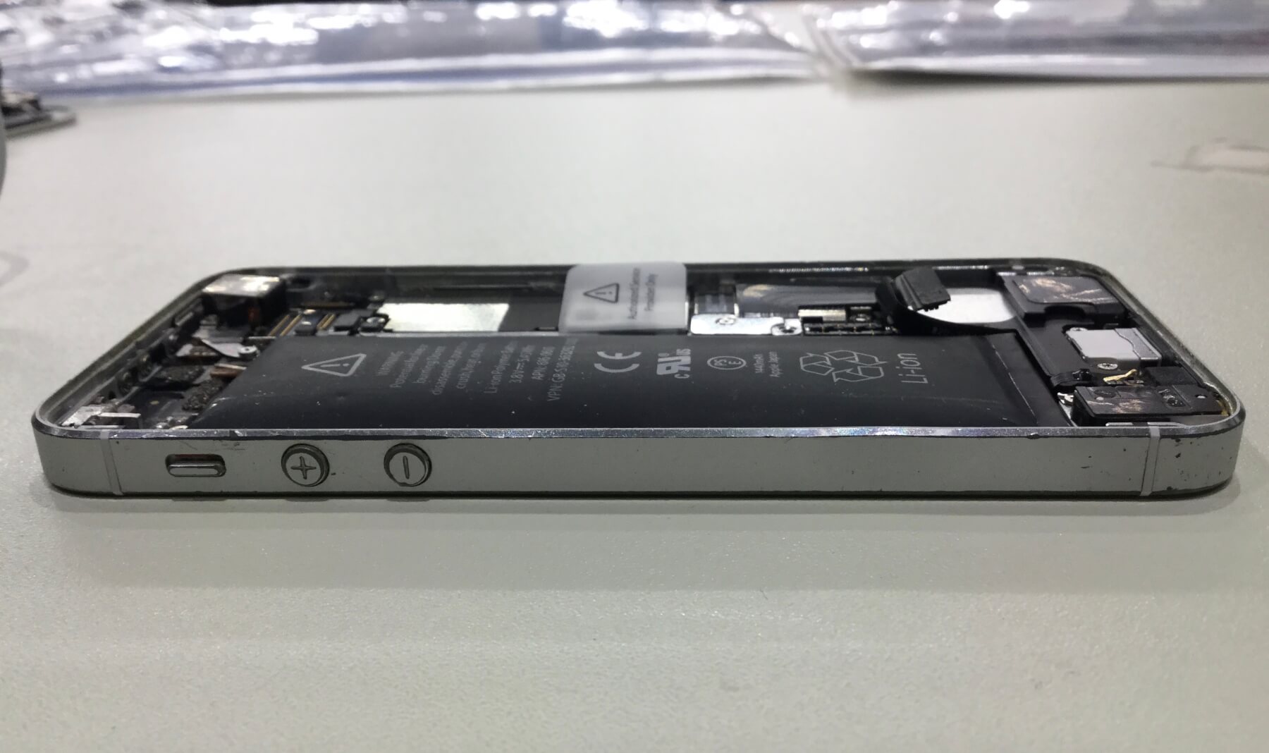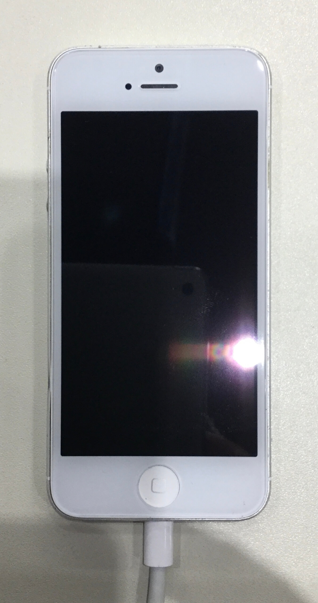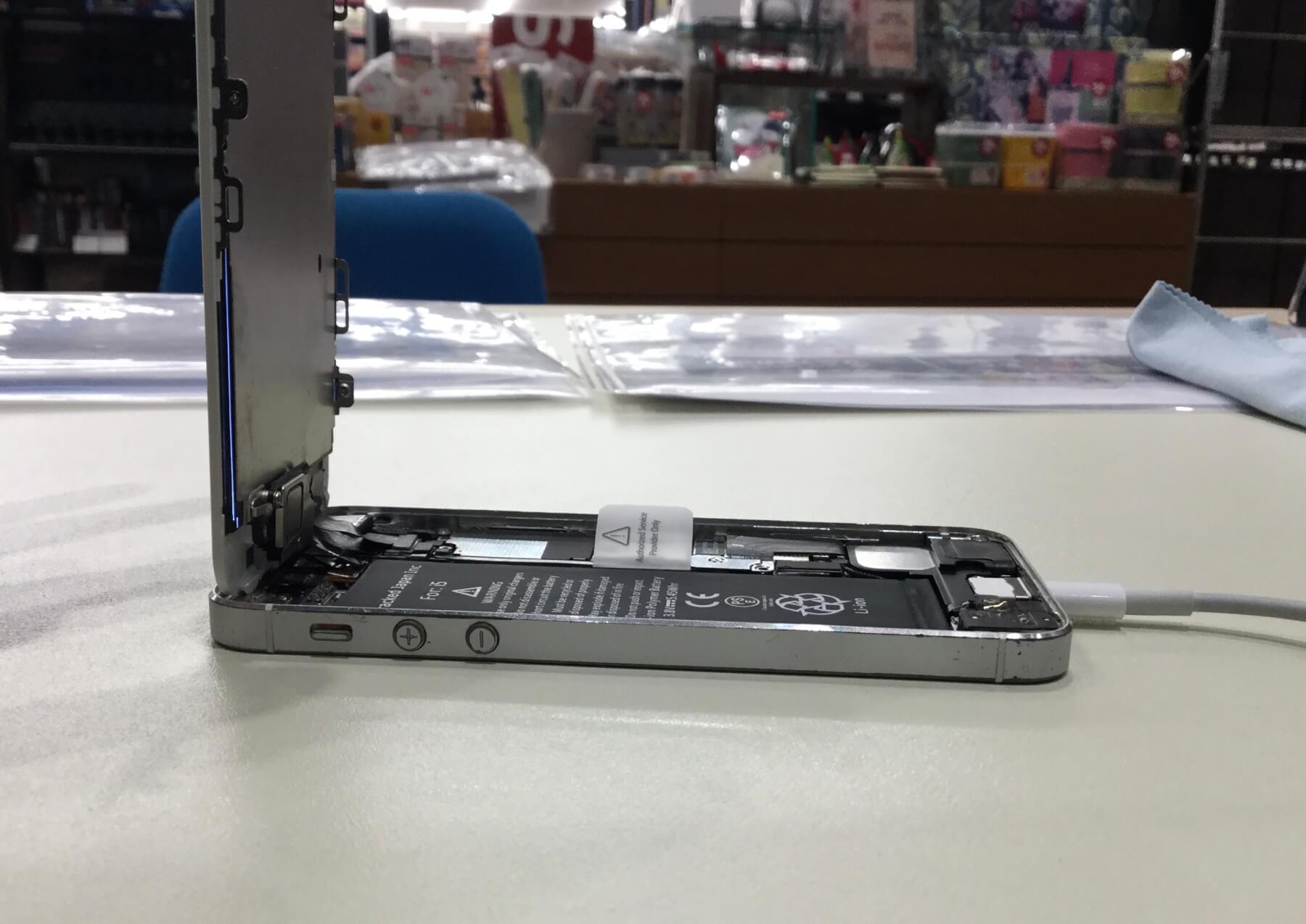 iPhone5で画面が割れてしまいバッテリーの膨張が原因でディスプレイを押し上げられていて、さらにバッテリーの劣化でずっと充電器に接続しても電源が入らない状態になっていました。