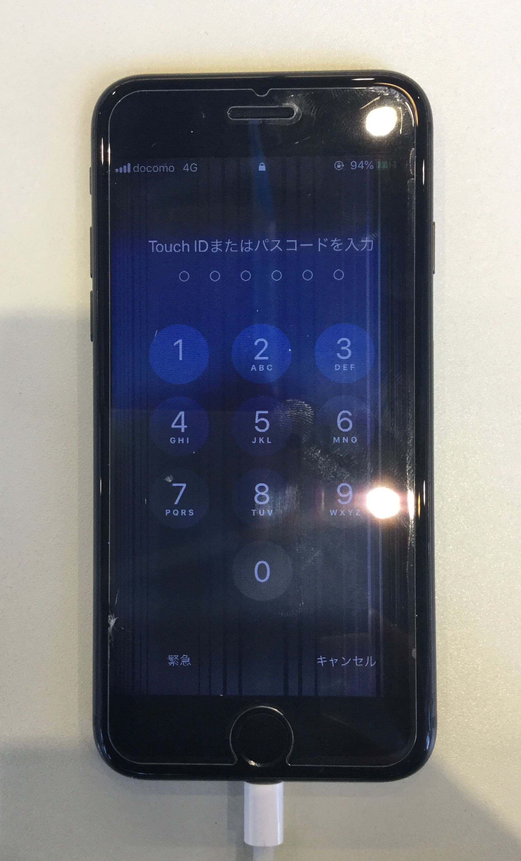 割れているのはガラスフィルムだけでiPhoneの画面は割れていませんでしたが、縦線が入りさらに操作もできなくなっていました。