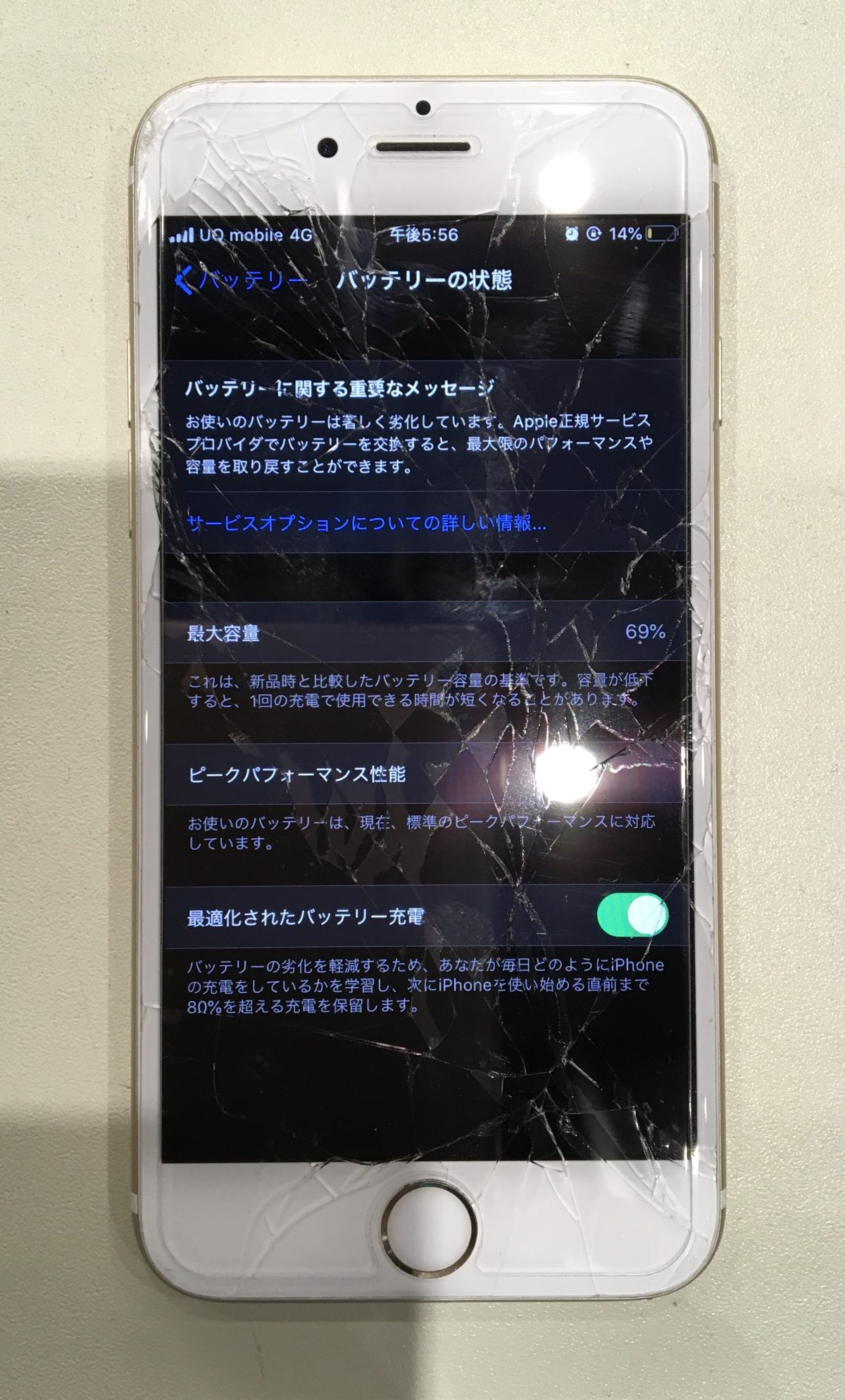 何度か落とされたそうで画面全体が割れてしまい、電池の持ちも悪いということで最大容量を確認すると69%で劣化していました。
