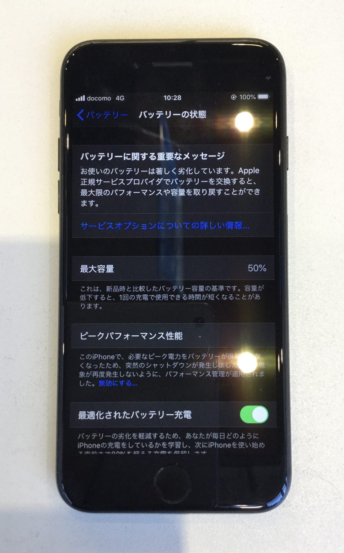 先日お預かりしたiPhone7も最大容量が50%になっていて常に充電していないと使えないとのことでした。