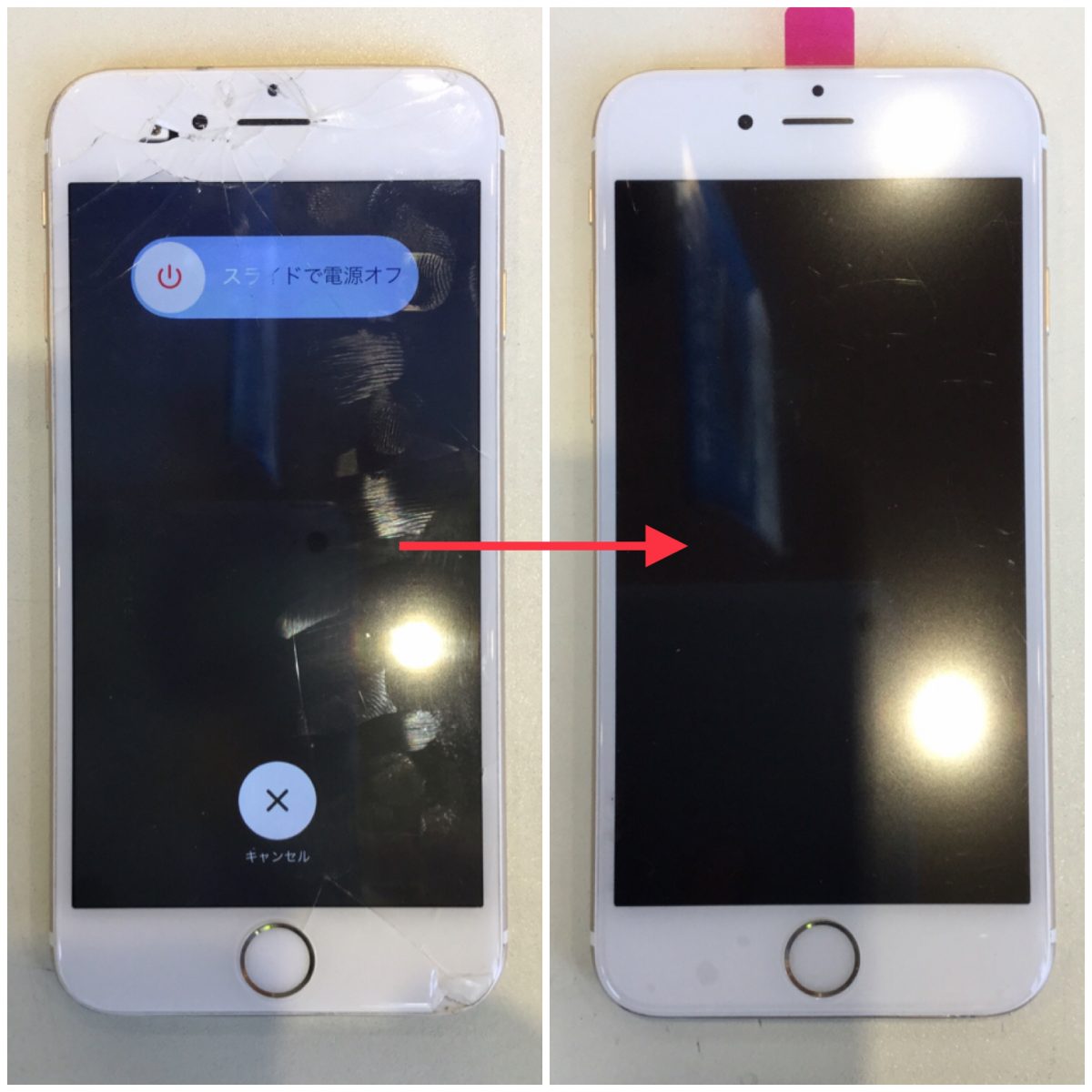 iPhone6のディスプレイ交換修理を承りました。上部の割れが特にひどく、操作しようとしてもタッチがきいたりきかなかったりしていました。スライドできないので電源を切ることもできません。