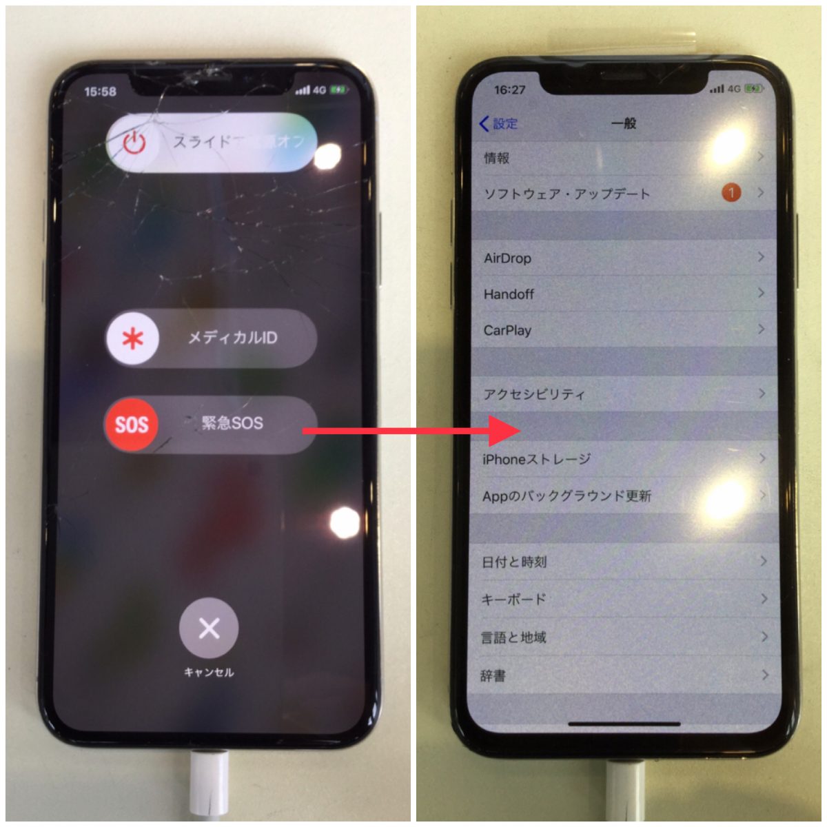 iPhoneXをご利用で画面が割れていても使えていたのに急に操作ができなくなったとご相談いただきました。ロック画面の解除もできず電源を切ろうにもスライドできず電源が切れません。