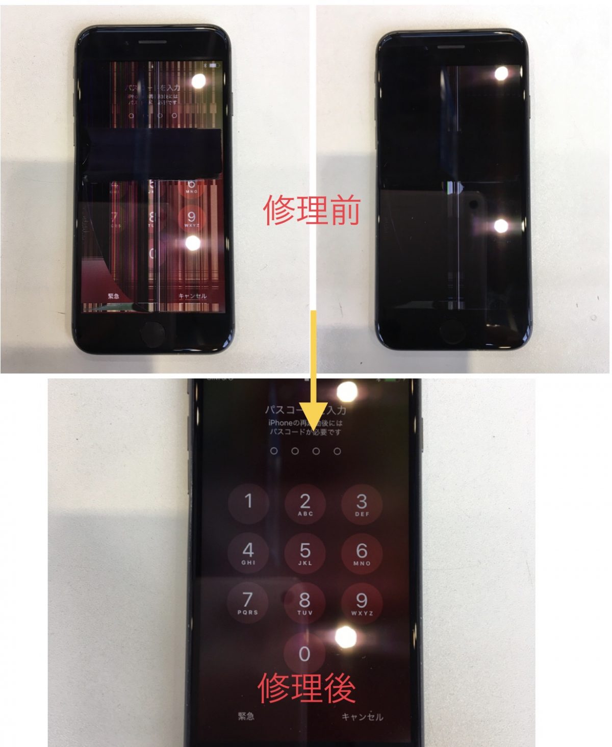 iPhone8の修理を承りました。今回は落としてしまうとなりやすい画面割れではなく、全く割れてはいないのに液晶が割れてしまい線が入ったり一部が真っ黒になり操作できなくなってしまったケースです。画面が割れても操作できる、というのはよくありますが、逆もあります。