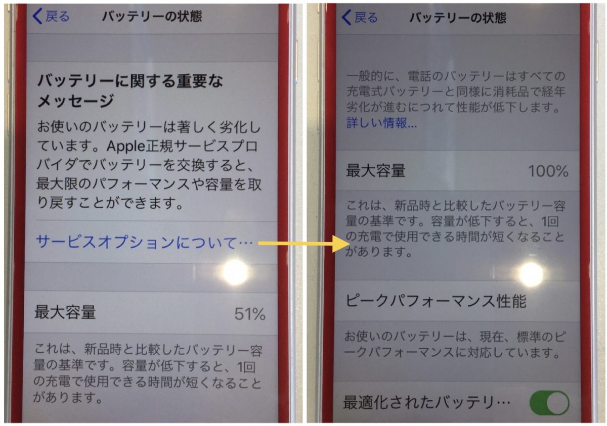 バッテリーの状態を確認すると最大容量は51%、「お使いのバッテリーは著しく劣化しています」と表示されていて、使っているとみるみるうちに電池が減っていくとのことでした。