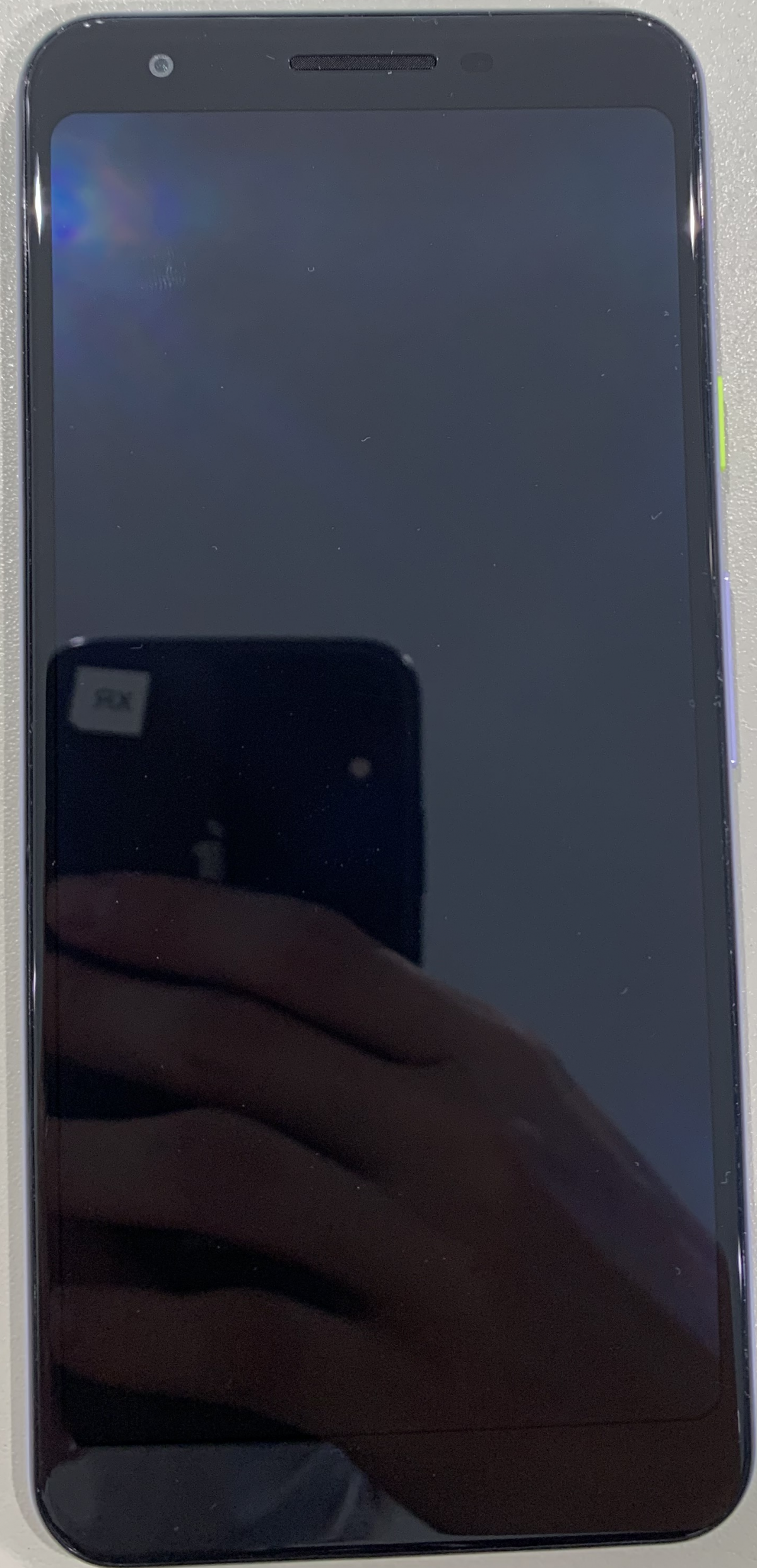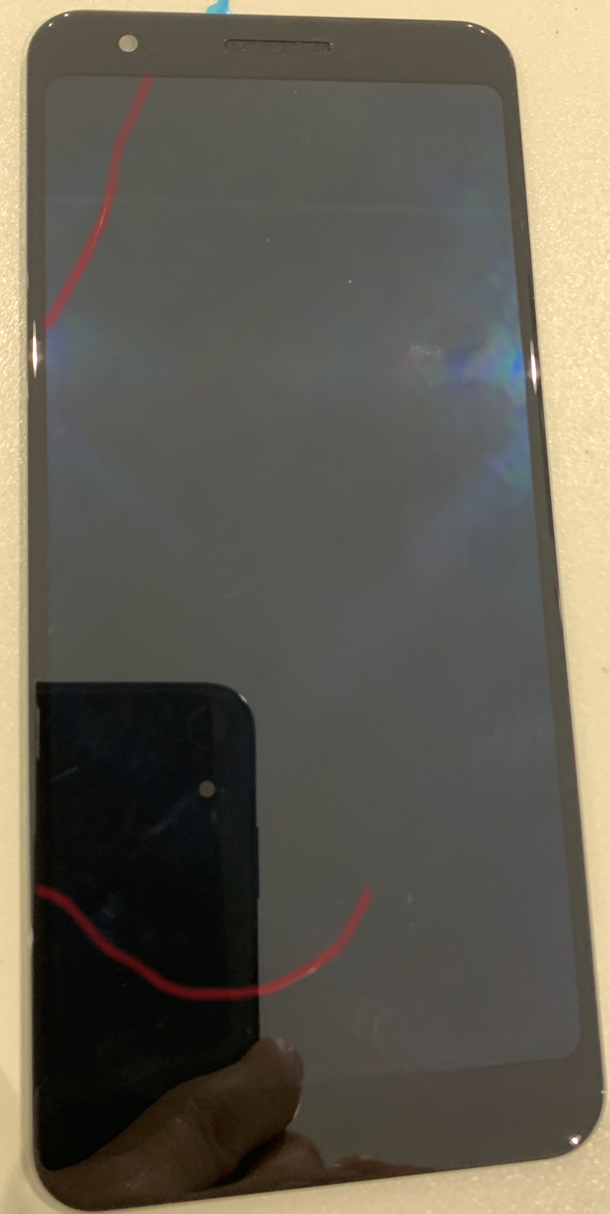 落下をさせてしまい、液晶は割れることはありませんでしたが、中のOLEDが割れてしまい画面が映らなくなってしまったPixel3a。この場合、画面が映っていないだけで指紋の反応などはしっかりとあることが大半です。下記画像の赤線は、亀裂が入ってしまっている場所となります。