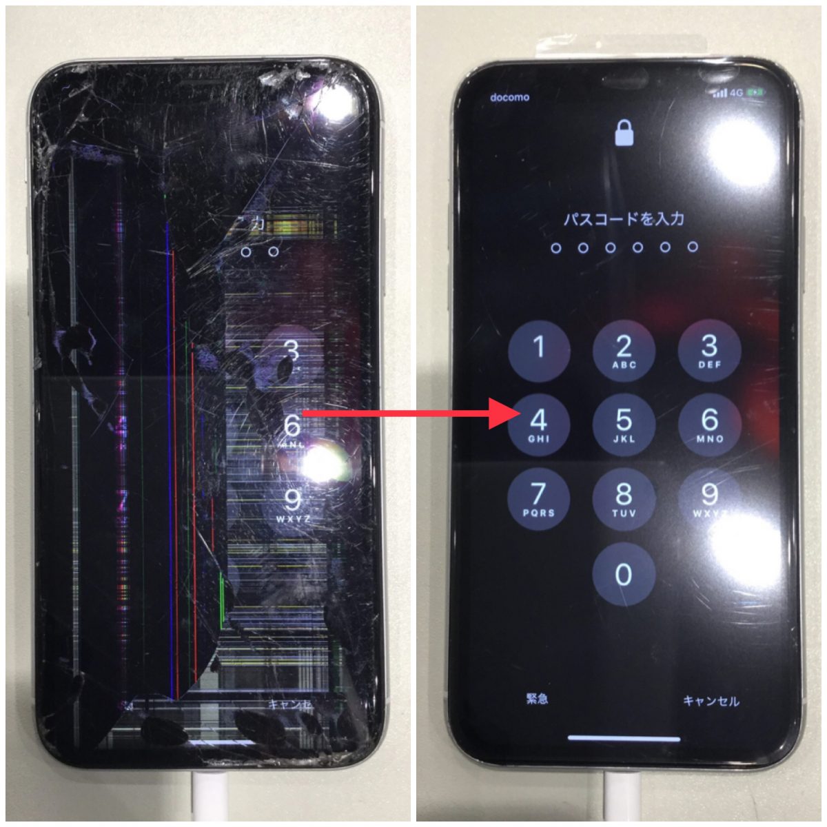 この状態でもデータを消さずに修理は可能で、ディスプレイ交換をすれば元どおりにお使いいただけるようになりました。