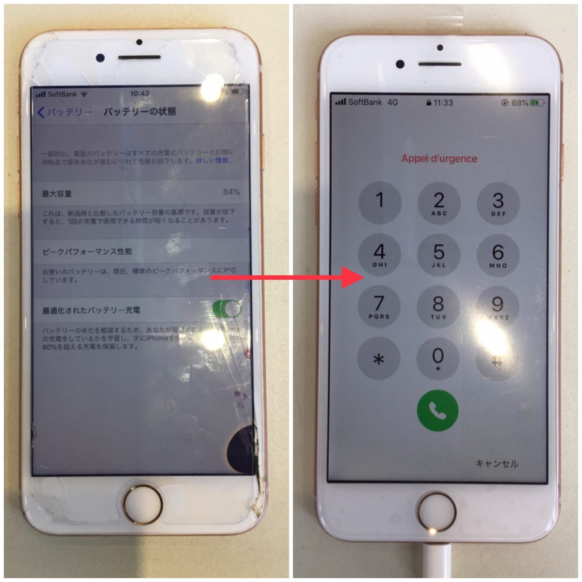 こちらのiPhone8はバッテリーの最大容量が84%になっていて、だいたい80%台になると充電の頻度がかなり高くなることが多いので交換時期だったと言えます。