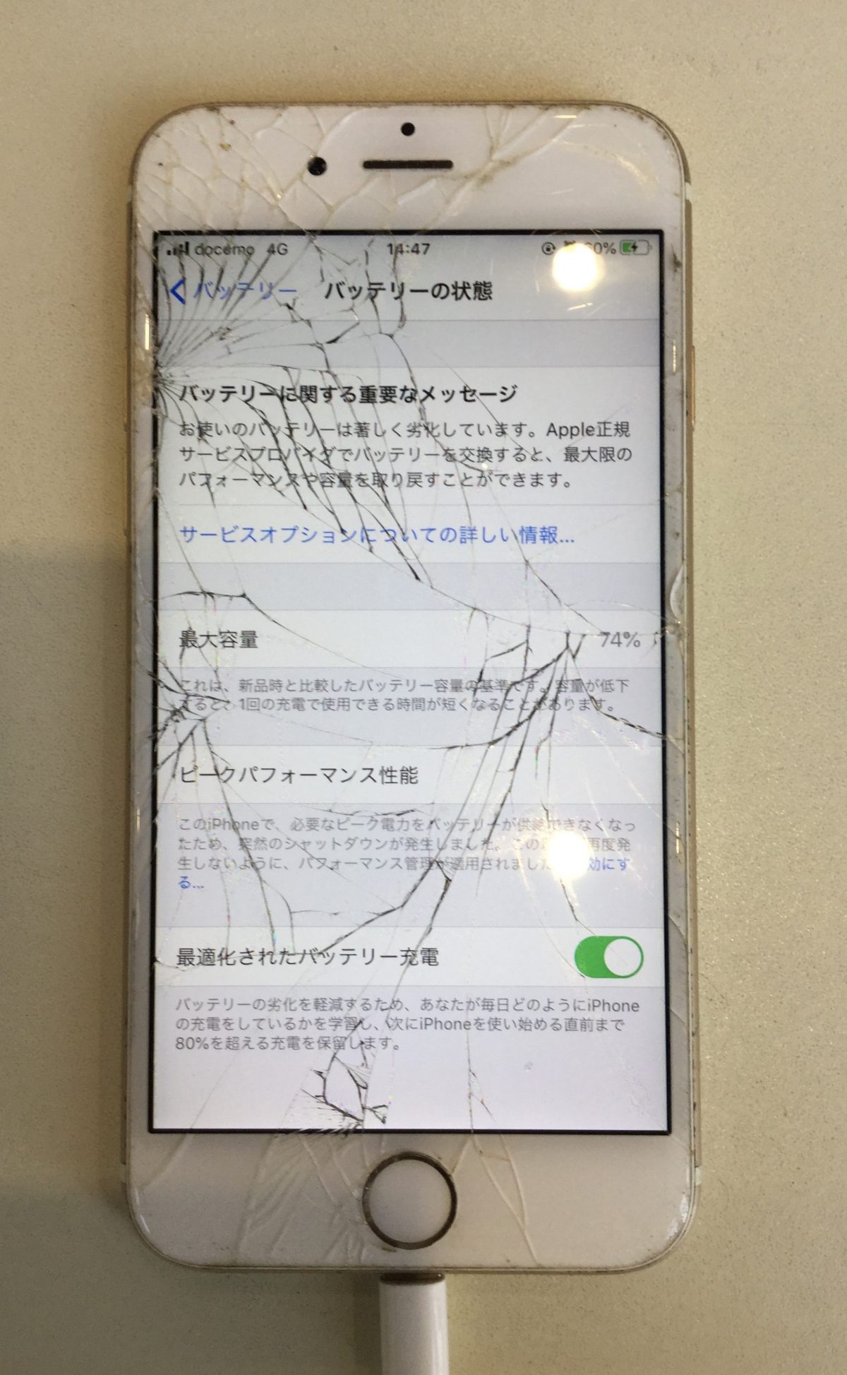 iPhone6sを落として画面全体がクモの巣状に割れてしまい修理を承りました。