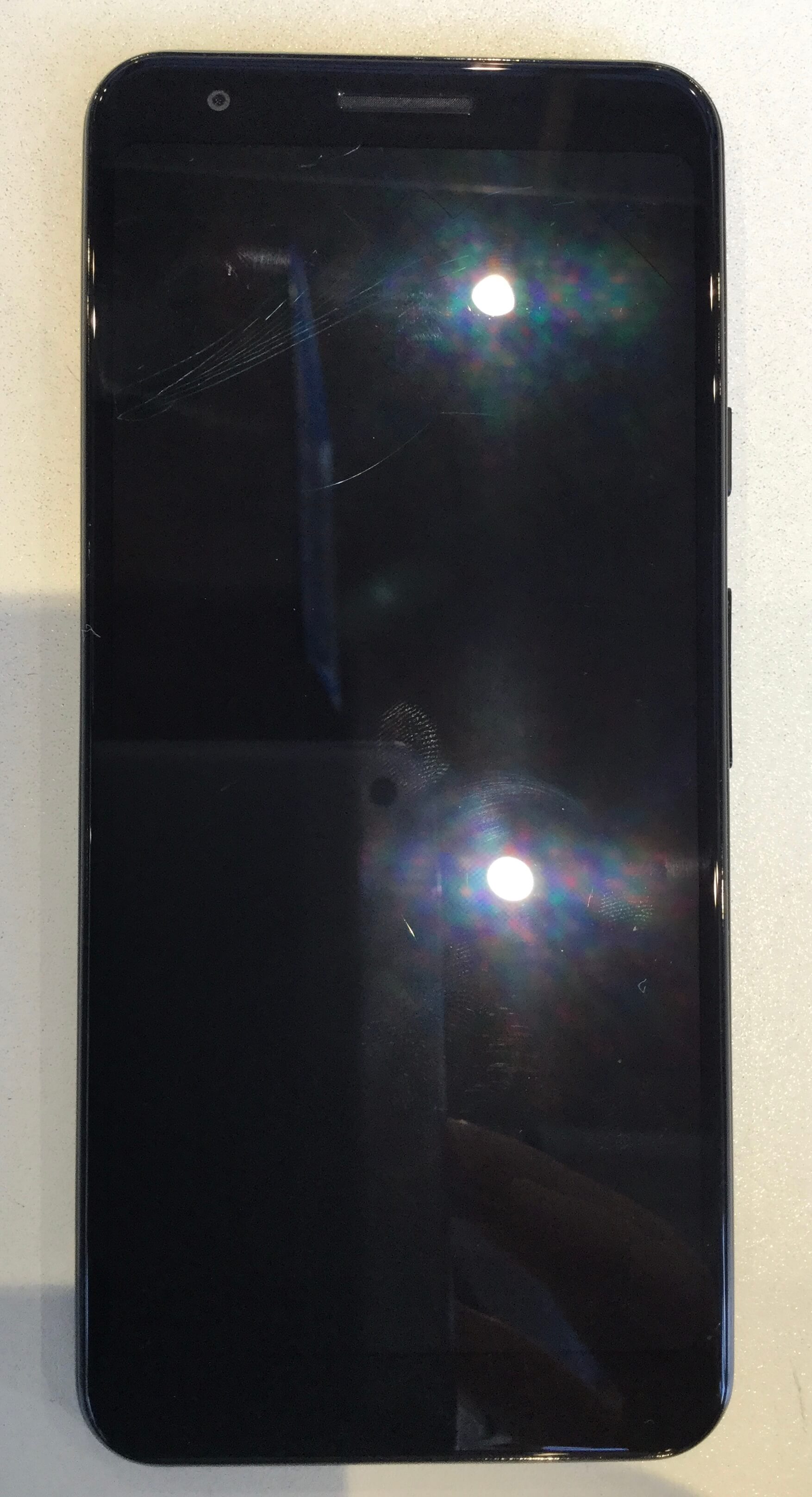 Pixelを使っていると時に落下させてしまって画面は割れなかったけど真っ暗になったとご相談いただきました。よく見ると表面のガラスは割れていないものの内部に割れが見受けられ、それが原因で表示されなくなってしまっていました。着信音や通知音は鳴っていたそうです。
