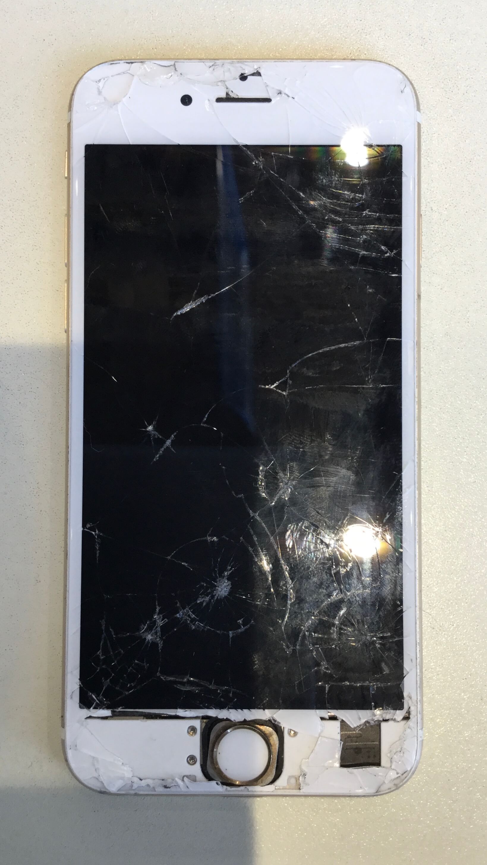 iPhoneを落としてしまってガラスが一部なくなるほど割れて操作ができず使えなくなってしまっただけでなくホームボタンも使えなくなり修理を承りました。下の写真でホームボタンが少しズレていますが、ホームボタンとディスプレイを接続するケーブルが断線していたため本来固定されているはずのホームボタンが動いてしまう状態でした。