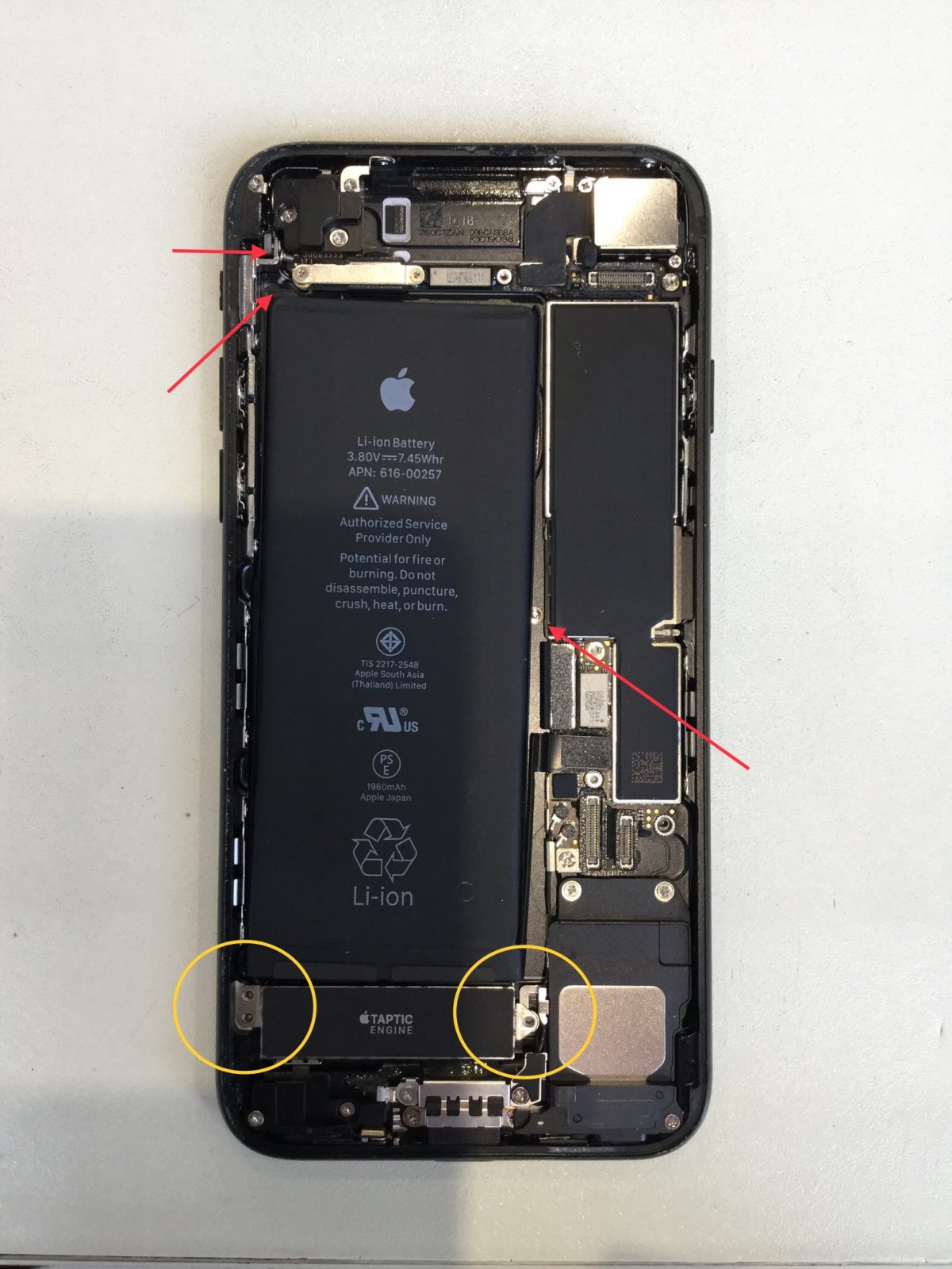 iPhoneの中を見るとTaptic Engineというバイブレーションなどの振動をさせるモーターを固定しているはずの3本のネジが全て外れていました。変な音がしたりiPhoneを振るとカチャカチャと音がするのは外れたネジのせいでした。