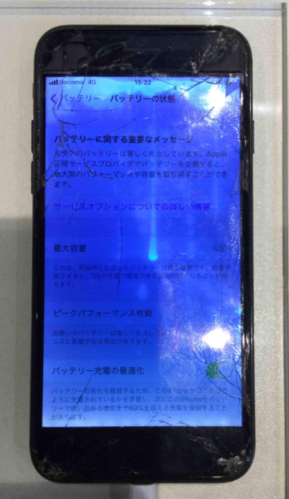 iPhone6sをお使いのお客様から画面にヒビが入っただけでなく全体が青くなり見づらくなっていると修理のご依頼を頂きました。今までに見たことのない画面になっていたので直るのかどうか心配されていましたがディスプレイ交換で無事に修理ができました。また、電池の持ちも悪いとのことでしたのでセット割で2,200円お安く交換ができました。同時に修理をすると何度も来店する手間がなくなりますしお得に修理ができるので気になる箇所が複数ある場合はセットでの修理がおすすめです。