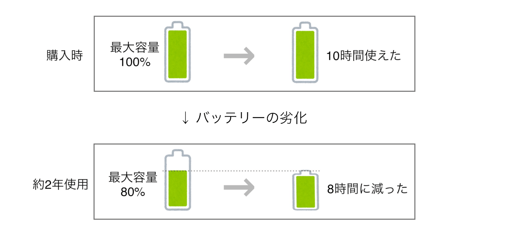 例えば図のように、購入したばかりは10時間使用できたが、バッテリー劣化で最大容量80%になりバッテリーをフルに充電しても8時間程度しか使えない、といったものです。