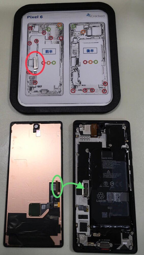 中を開けて、画面のケーブル(緑丸で矢印のところに接続されています)