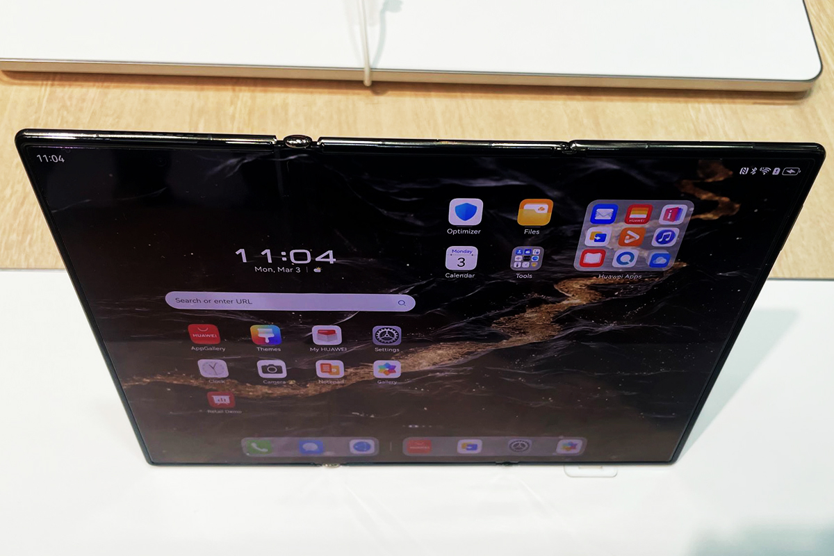 Huaweiのブースには2024年9月に発売した三つ折りスマホが展示されていました。日本では売られていないモデルなので現物を見るのは初めてです。拡げた時はとても薄いですね。凄いとは思いますが折りたたんだ時はどうしても+1枚のせいで分厚くなってしまうのと、手に持つとやはり重たく感じます。さらに販売価格は50万円とのことですので現段階での普及は期待できないですね。Huaweiの技術力を示すために投入された製品というところでしょう。